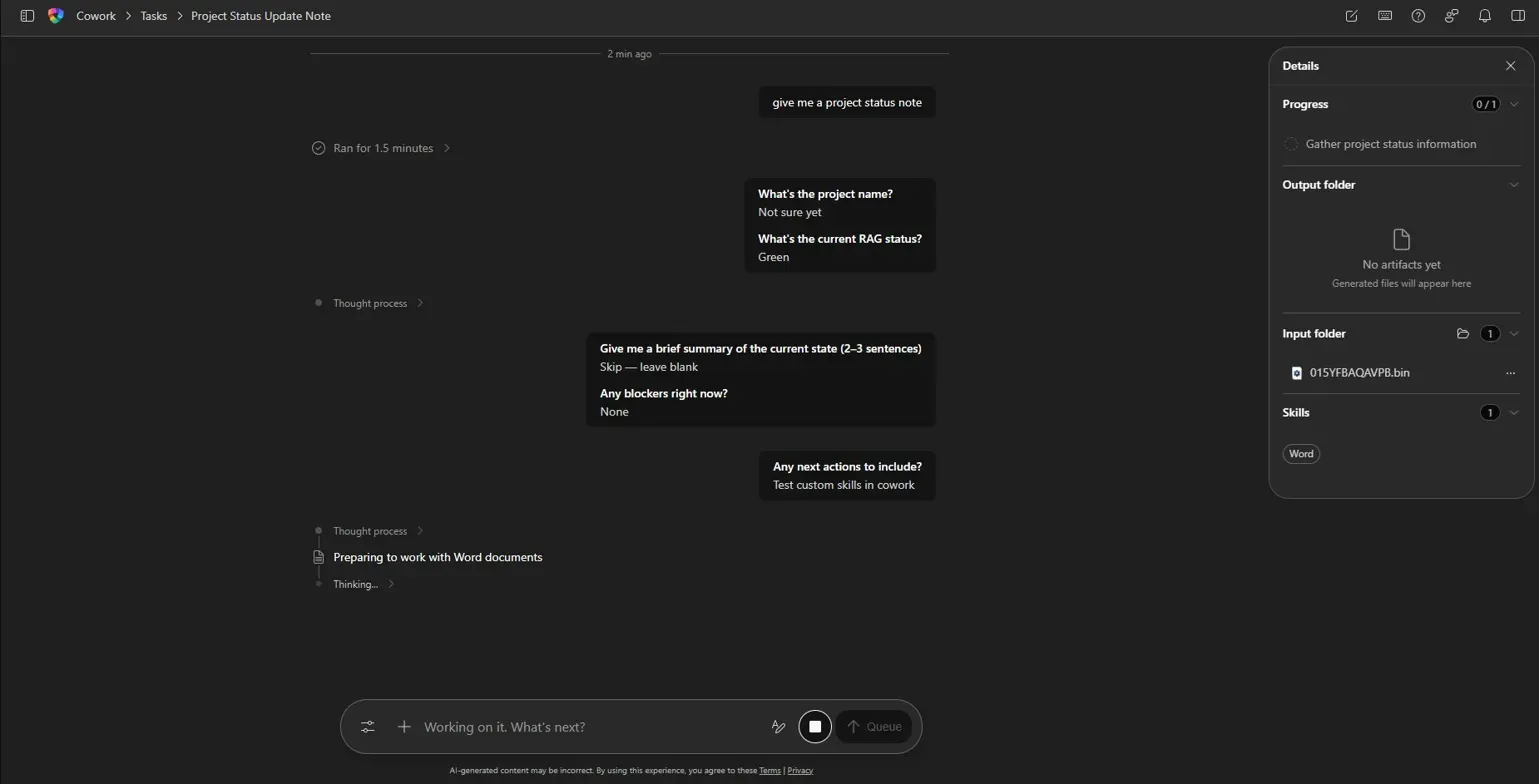 Cowork asked for project name, RAG status, summary, blockers, and next actions. In sequence. Exactly as specified. I was just trying stuff out. It would be much more useful if it actually gathered the data.