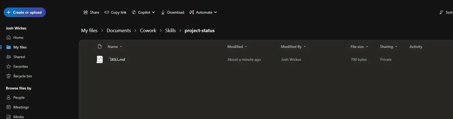 The documented setup is simple enough. Drop a SKILL.md file in your OneDrive: